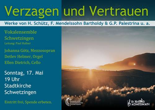Am Sonntag, 17. Mai, um 19 Uhr lädt das Schwetzinger Vokalensemble zu einem Konzert in die Evangelische Stadtkirche ein. Unter der Leitung von Paul Hafner steht der Abend unter dem Titel „Verzagen und Vertrauen“.